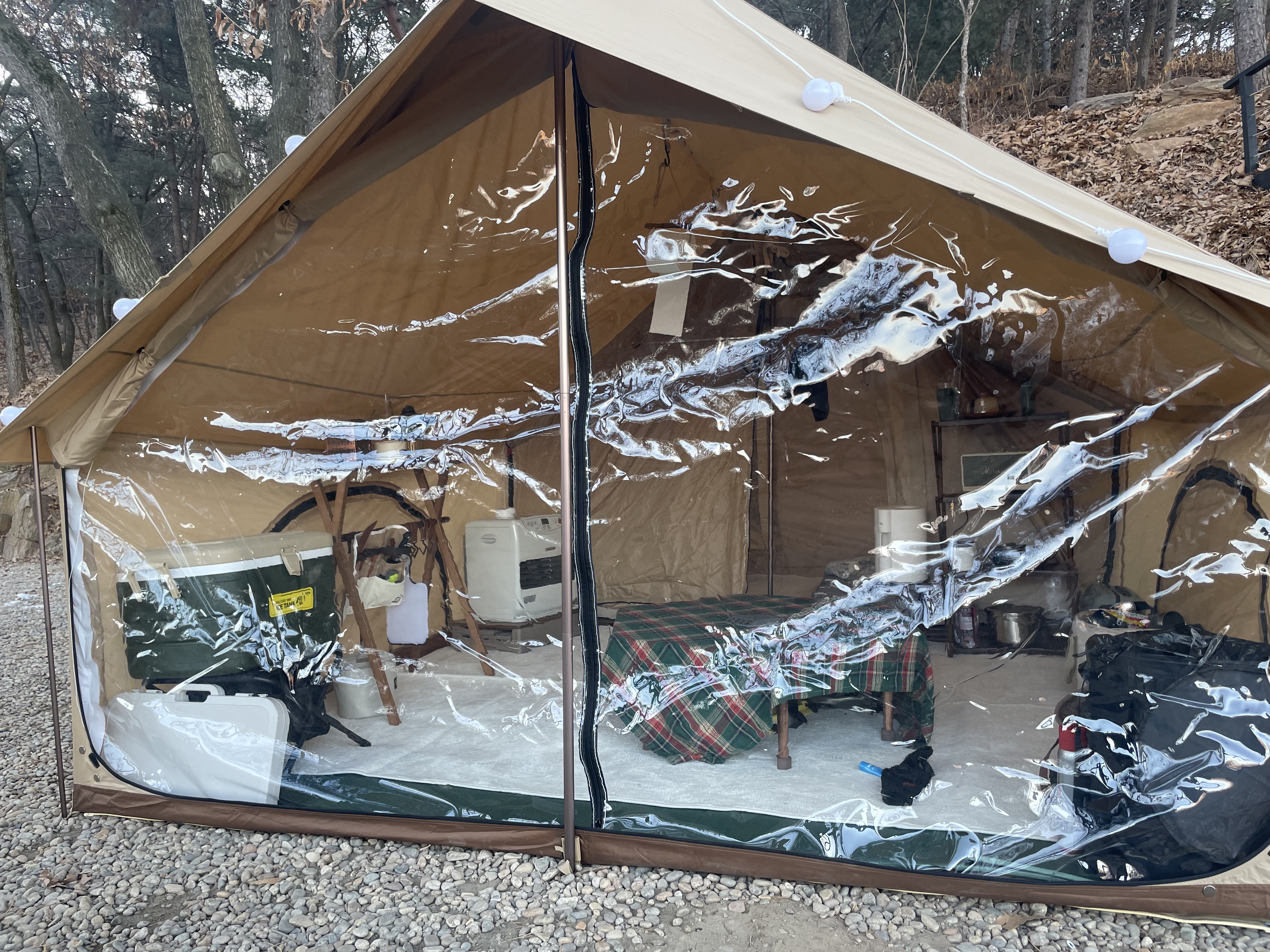 텐트 측면부까지 다 덮어버린 후 우레탄창 부분이 아닌 옆문을 이용하는것처럼 보였다.